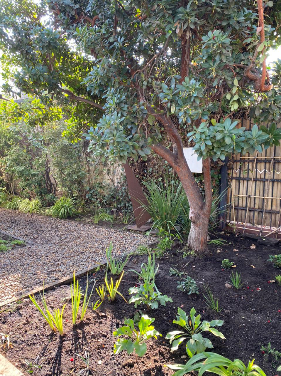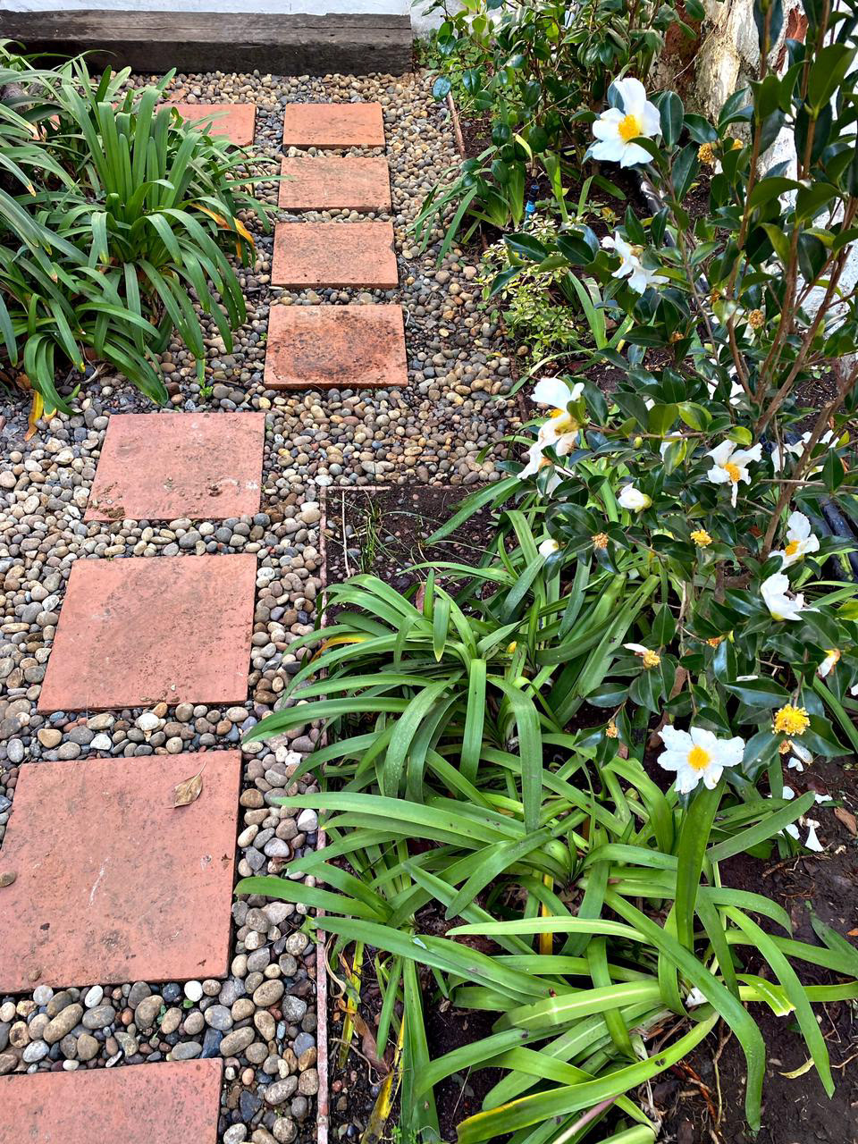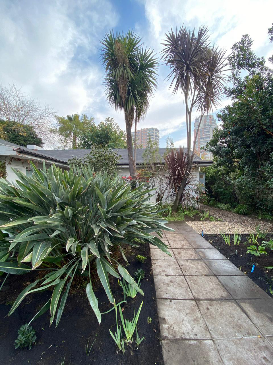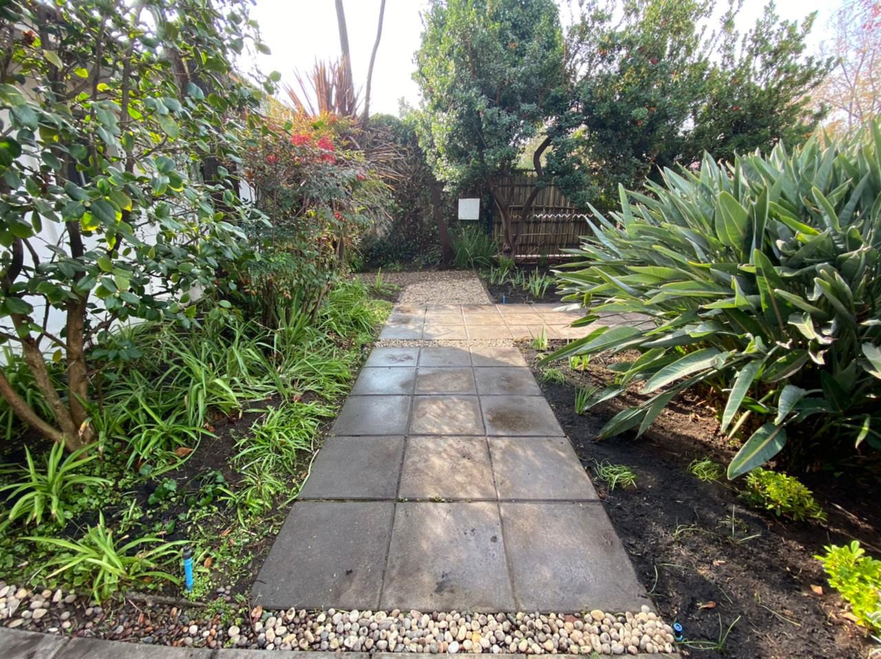 Restauración completa de Jardín. Se reemplazo pasto por gravilla, se incluyeron herbáceas y plantas de bajo requerimientos. Agregamos color y textura a los macizos existentes y se realizo una limpieza profunda de malezas, podas de árboles, palmeras y arbustos, y control de plagas. También se modifico el sistema de riego para optimizar el agua.